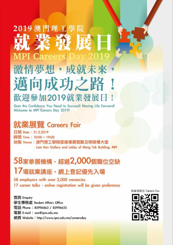 为向企业及大学生提供粤港澳大湾区职业配对平台,澳门理工学院于2月21日起举办“2019就业发展日”系列活动,届时将有澳门及珠海五十八间机构参展,分别来自政府部门、银行金融、酒店博彩、传媒、资讯科技、多媒体设计、汽车服务、饮食零售、休闲娱乐及教育等多个领域,并提供二千多个职位空缺,欢迎澳门各高校学生参与,开拓理想前途。