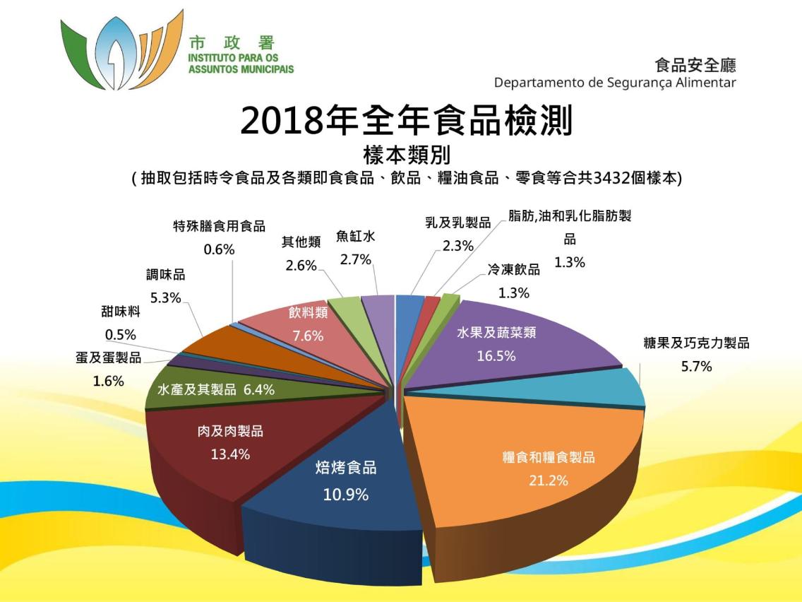 总结二○一八年食品检测结果,市政署在市面上合共抽取了三千四百三十二个食品样本,当中五十个样本来自本澳经营的网上商店。三千四百多个样本中,有十一个样本未能通过检测,整体合格率达百分之九十九以上。市政署已对十一个不合格样本作即时跟进处理,通报食品生产来源地的食安部门;要求本澳商户停售及销毁有问题的产品,协助追查有关产品的来源及制备流程;亦即时发出新闻稿公布有关情况。有关二○一八年恒常食品市场检测结果已上载至食品安全资讯网www.foodsafety.gov.mo及食安资讯手机应用程式,欢迎公众登入浏览详情。