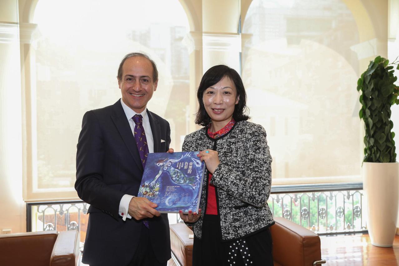 穆欣欣对总领事一行表示欢迎,并向他们介绍澳门的文化事业发展,希望未来与法国驻香港及澳门总领事馆有更多的合作计划,包括加强澳门艺术博物馆与法国博物馆之间的紧密联系,以及探讨与法国五月项目合作的可能性,日后文化局将继续邀请领事参观澳门的文化设施及出席各项节庆活动;官明远亦表示,透过是次会面可加深瞭解澳门的文化发展方向和双方的合作意愿,建立长远及稳定的合作关系,深化两地的文化交流,亦期望有机会将法国优秀的艺术展览带来澳门,为观众提供高质素及多元化的国际展览。