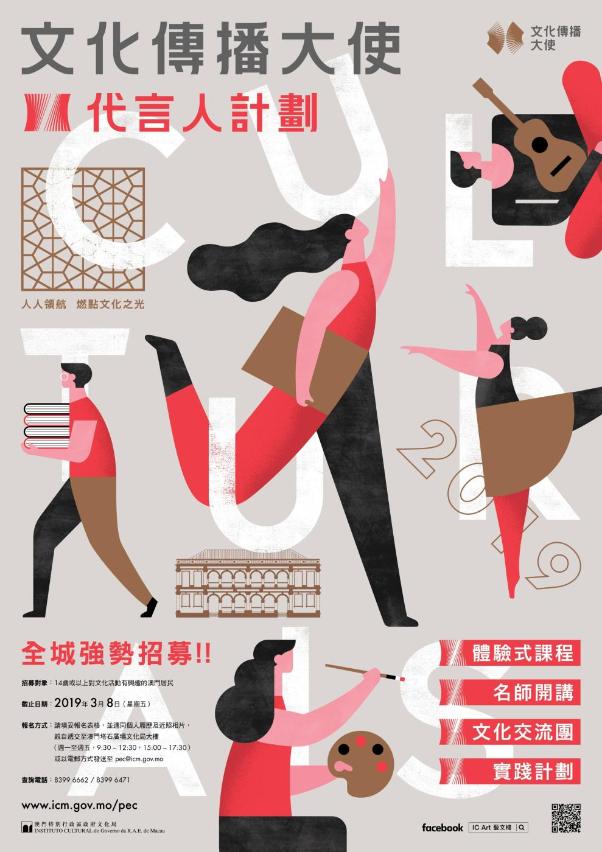 文化传播大使“代言人计划”现正招募年满14岁或以上、热爱文化艺术的澳门居民,透过一系列体验式培训课程培育本地文化“代言人”,促进文化传播传承。活动费用全免,报名截止日期至3月8日。