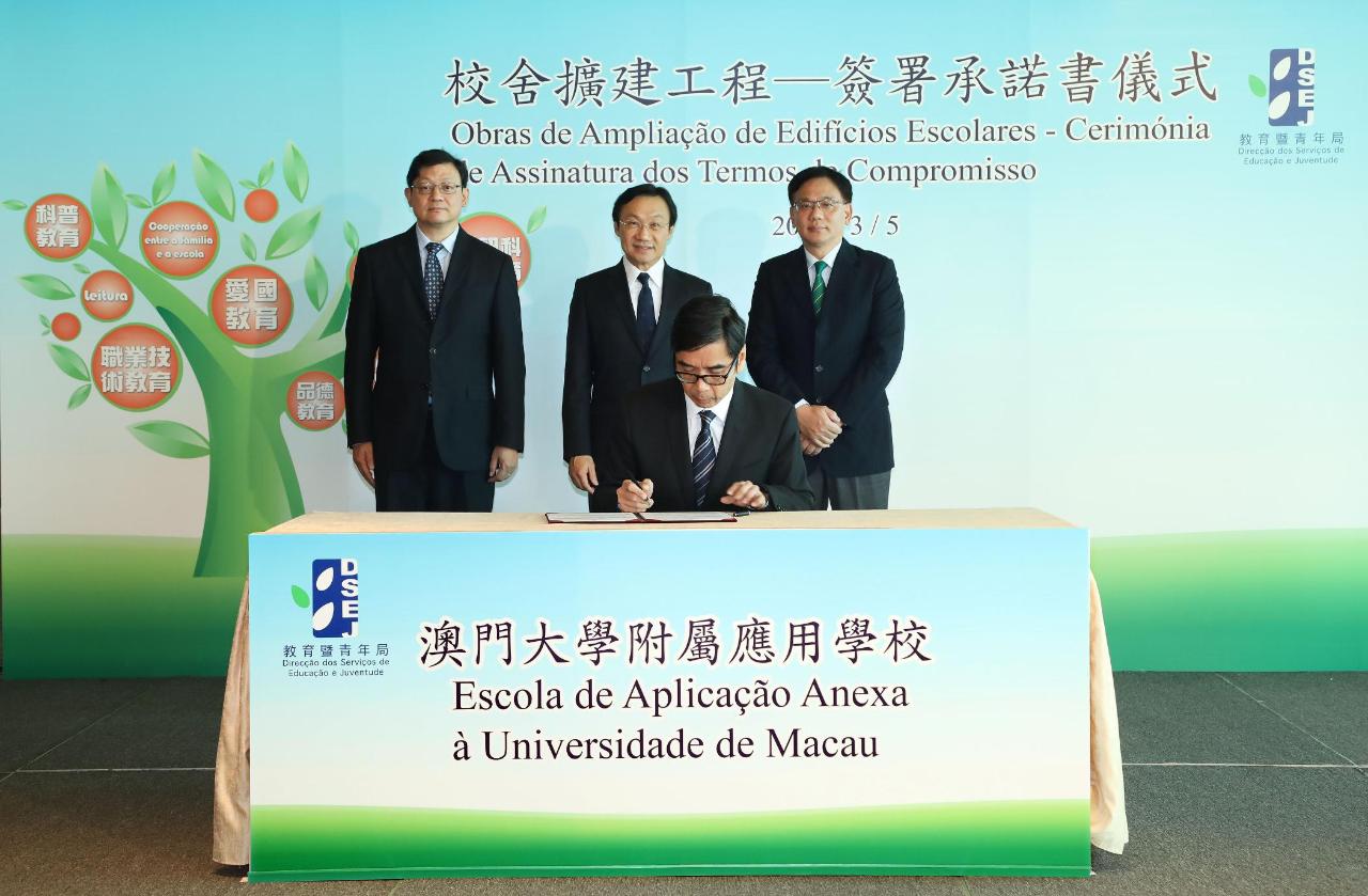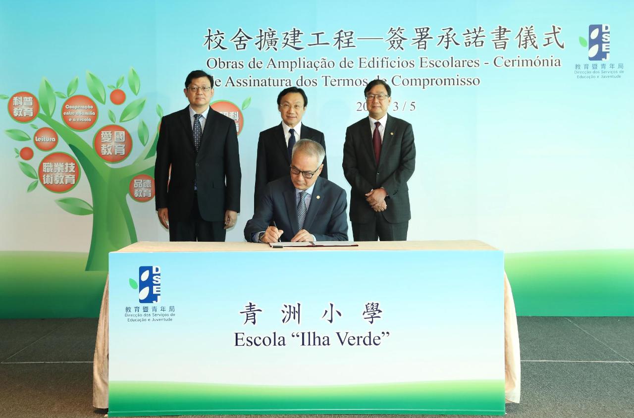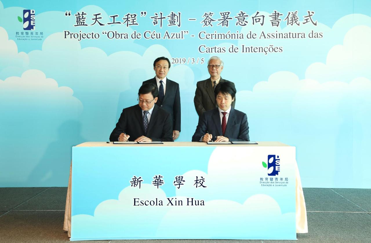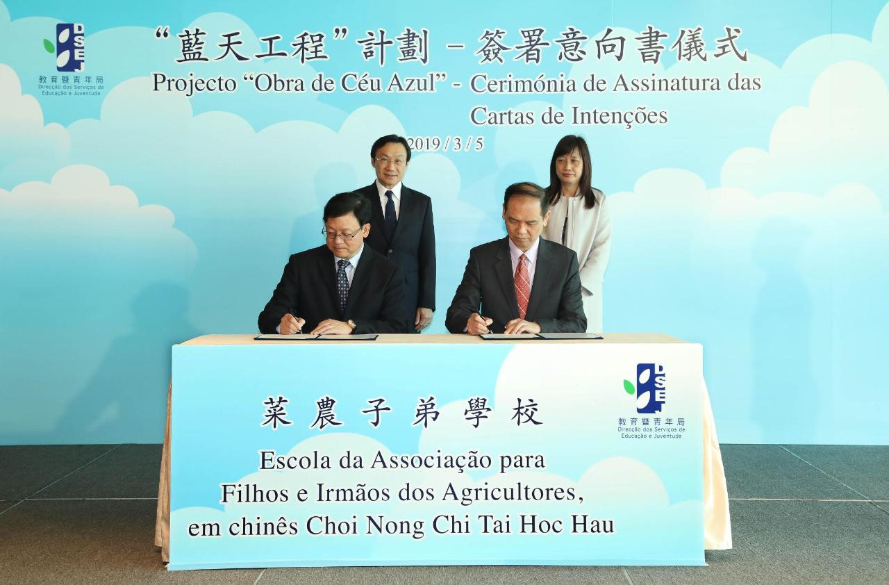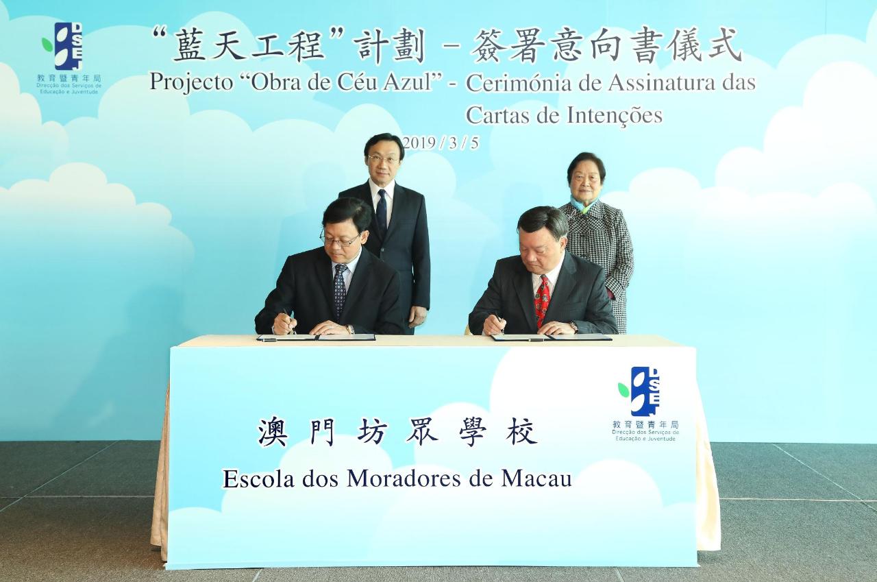 会议开始前举行了“蓝天工程”意向书签署仪式及校舍扩建工程承诺书签署仪式。在谭俊荣及澳门坊众学校校监区天香、澳门蔡氏教育文化基金会理事长罗永强、澳门菜农合群社理事长戴燕芳、教业中学教育协进会理事长何敬麟及协同福利教育总会副主席Rev. David Bush的见证下,教育暨青年局局长老柏生与澳门坊众学校校董会主席胡顺谦、澳门蔡氏教育文化基金会执行董事蔡隽思、澳门菜农合群社会长江晓瑜、教业中学教育协进会副理事长贺诚及协同福利教育总会委员林剑如签署了澳门坊众学校、新华学校、菜农子弟学校、教业中学及协同特殊教育学校参与“蓝天工程”的意向书。接着,在谭俊荣、老柏生及澳门中华总商会副主席徐达明及澳大附属学校协会副理事长葛万金的见证下,澳门中华总商会副主席余健楚及澳大附属学校协会理事长姚伟彬分别签署了青洲小学及澳门大学附属应用学校参与校舍扩建工程的工作备忘及承诺书。