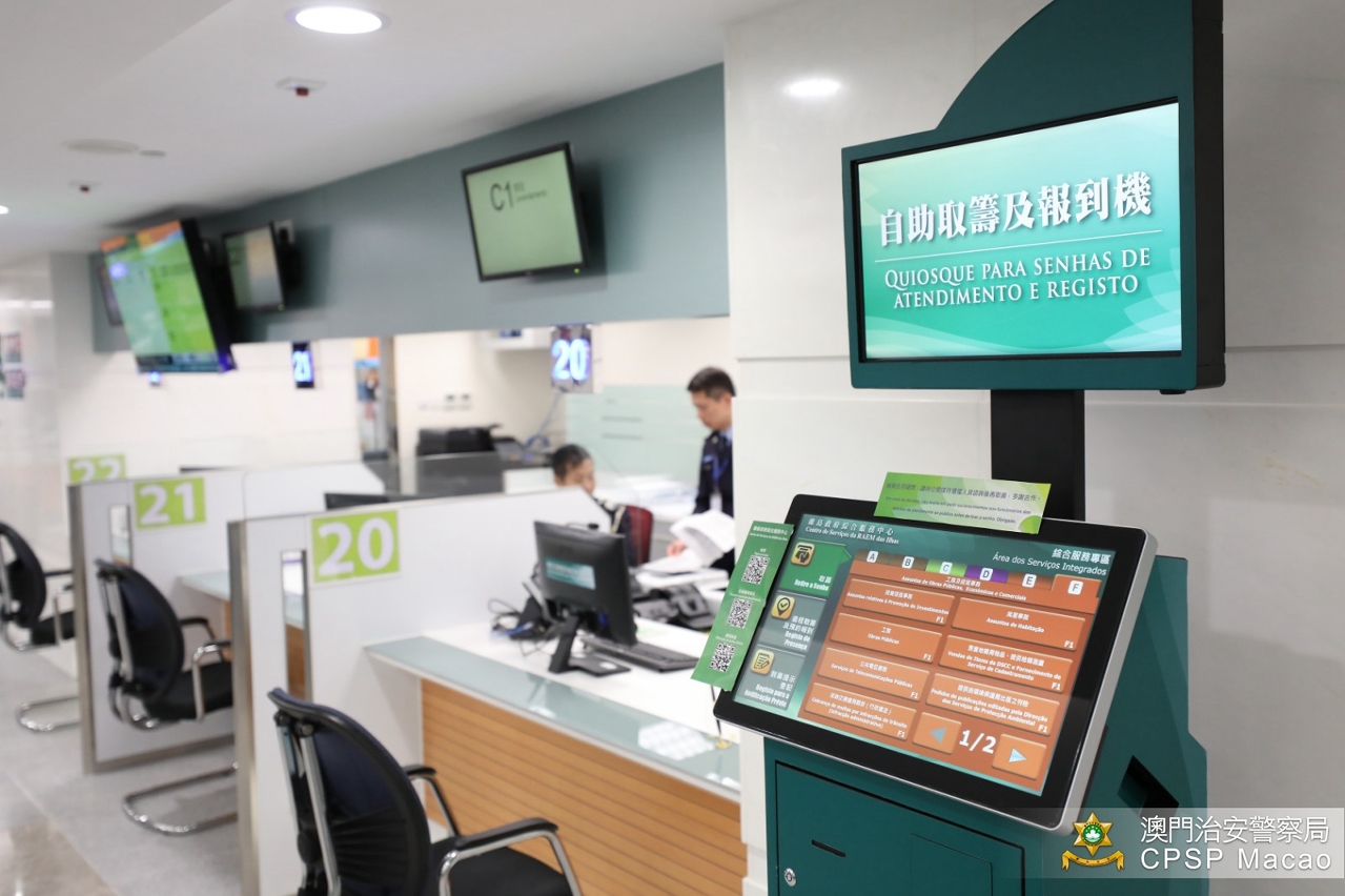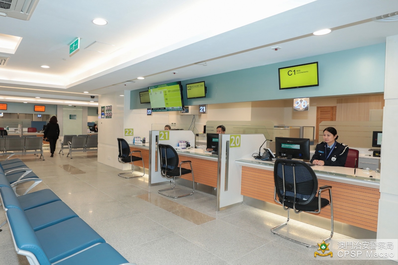 位于氹仔基马拉斯大马路225号三楼的离岛政府综合服务中心于今日(18日)启用。治安警察局于服务中心三楼C区设立三个柜台,向公众提供家务工作雇员及专业外地雇员之续期及补期,以及领取外地雇员身份认别证服务。上述两项服务均可于网上预约,而服务中心亦设有24小时自助服务机,可办理个人出入境纪录证明书及家务工作外雇续期。