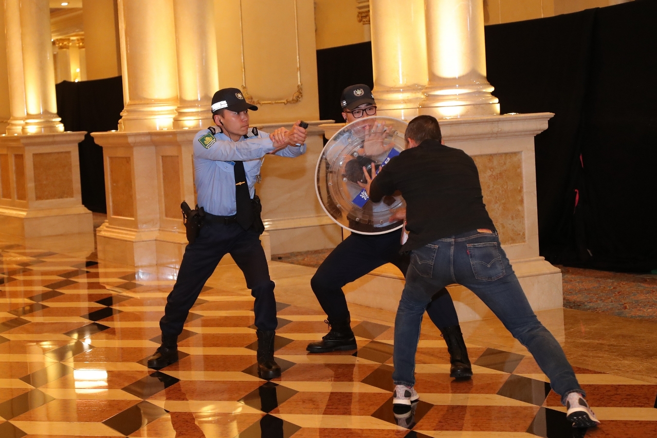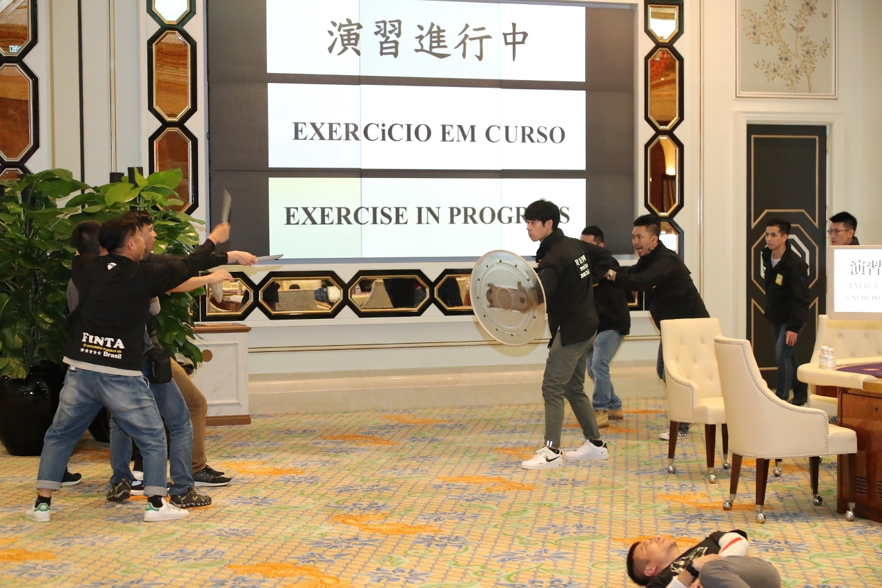 演练模拟于路氹城威尼斯人酒店之某贵宾厅内发生一宗多人持械寻仇、抢劫及挟持人质事件。事件中有6名匪徒强闯贵宾厅及砍伤3名赌客,期间共抢去300多万筹码,现场一度混乱并有多人跌伤,保安员随即进行疏散,并将事件通知司法警察局及博彩监察协调局,博监局经了解事件后随即启动重大事件联动机制。上述混乱中,先后有3名匪徒逃离现场。