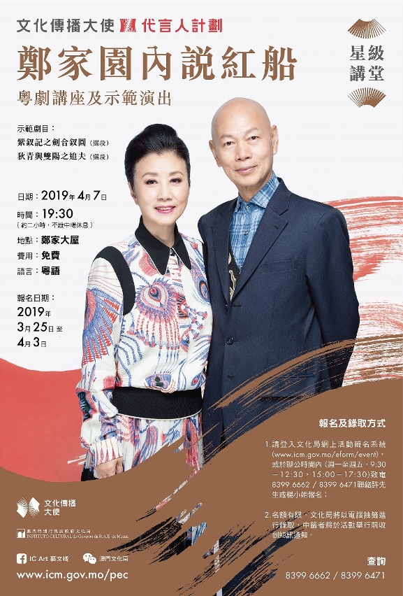 “郑家园内说红船—粤剧讲座及示范演出”将于4月7日晚上7时30分至9时30分在郑家大屋举行,有兴趣市民可于3月25日至4月3日期间,登入文化局网页“活动报名系统”www.icm.gov.mo/eform/event进行网上报名,或于报名期内星期一至星期五上午9时30分至中午12时30分、下午3时至5时30分,致电8399 6662许先生或8399 6471杨小姐报名。讲座以粤语进行,名额有限,如报名人数多于名额上限,将以电脑抽签进行录取,获录取者将收到短讯通知。更多资讯可浏览网页www.icm.gov.mo/pec。