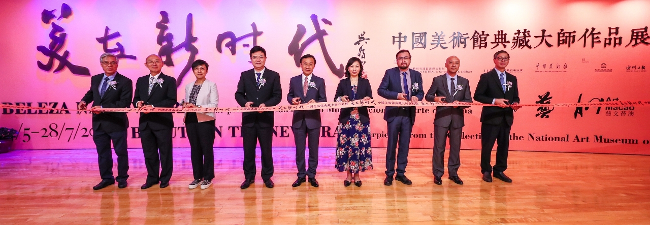 由文化局澳门艺术博物馆、中国美术馆主办,澳门特别行政区政府旅游局、澳门日报鼎力支持的“美在新时代──中国美术馆典藏大师作品展”于今日(5月3日)下午6时30分在澳门艺术博物馆四楼隆重开幕,由澳门特别行政区政府社会文化司司长谭俊荣、中央人民政府驻澳门特别行政区联络办公室副主任薛晓峰、文化局局长穆欣欣、旅游局局长文绮华、中国美术馆副馆长张晴、澳门日报社长陆波、澳门美术协会会长陆曦、颐园书画会常务副会长萧春源及文化局副局长陈继春主礼,场面热闹。