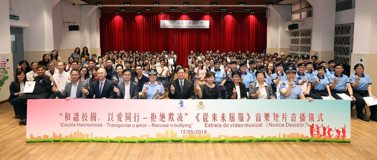 为加强推动和谐校园的重要讯息,教青局与治安警察局携手制作了“和谐校园.以爱同行 - 拒絶欺凌”《从来未屈服》音乐短片,并安排该短片于5月12日举行首播仪式,教青局局长老柏生、副局长梁慧琪、治安警察局副局长刘运嫦、学校师生代表、学生辅导服务机构及社团代表、音乐短片制作团队成员等逾二百人出席了首播仪式,场面温馨热闹。教青局期望透过短片向公众宣导共建和谐的校园和社区是每一个人的责任。欢迎市民于教青局和谐校园网页浏览及下载该音乐短片。(https://portal.dsej.gov.mo/webdsejspace/site/harmony/index.jsp)