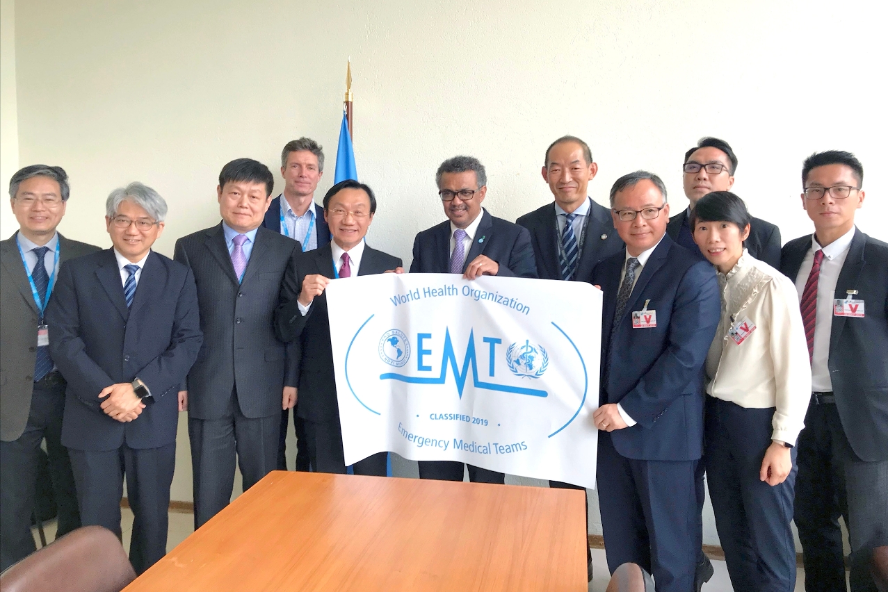第72届世界卫生大会期间,世卫组织总干事谭德塞博士于5月24日在联合国日内瓦总部为中国国际应急医疗队(澳门)和中国国际应急医疗队(天津)两支队伍举行了认证授旗仪式,社会文化司司长谭俊荣与卫生局局长李展润应邀出席仪式并接受认可证书。