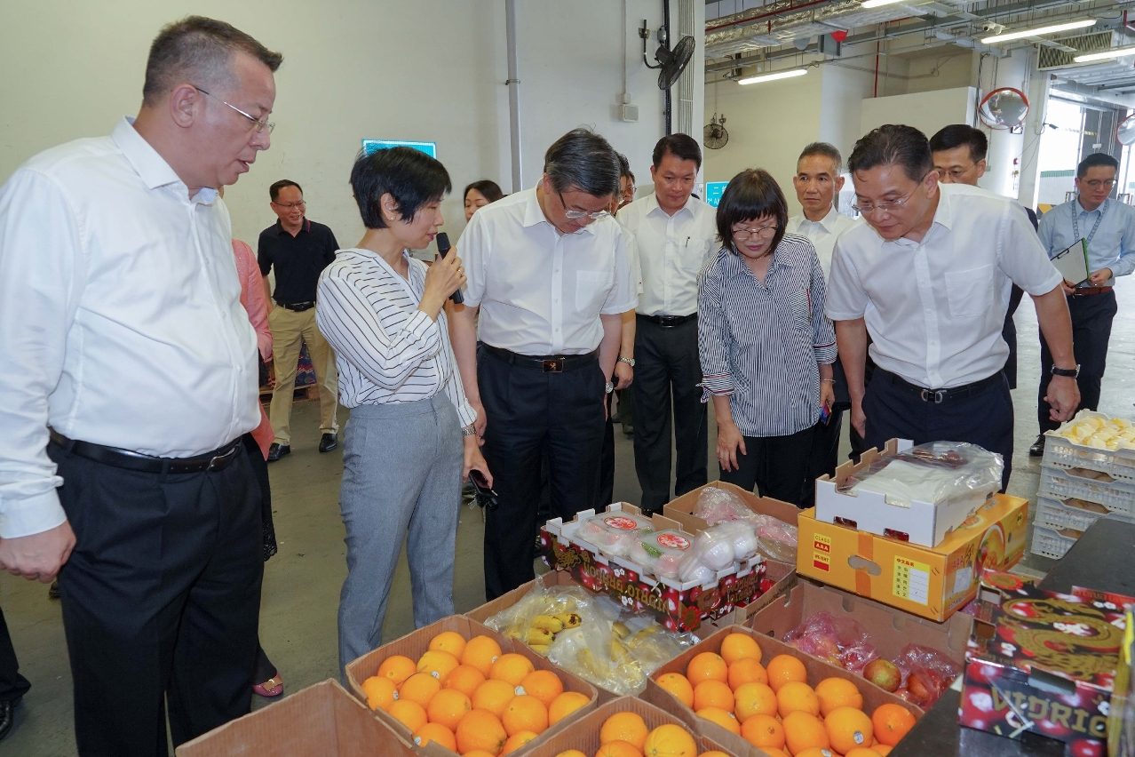 由国家海关总署署长倪岳峰率领的代表团,在市政署市政管理委员会主席戴祖义、副主席李伟农、委员吴秀虹及相关部门主管陪同下,于六月十八日到澳门新批发市场视察。人员向代表团介绍了供澳蔬菜、水果以及禽蛋的进口与检验检疫工作、食品和农产品溯源机制、批发市场的日常运作以及内地食品入口本澳后须经过的检验检疫程序等。倪岳峰亦与批发市场内的商户进行交流,了解供澳蔬果与禽蛋的货源、数量以及保障食品安全相关的保质保鲜技术等。