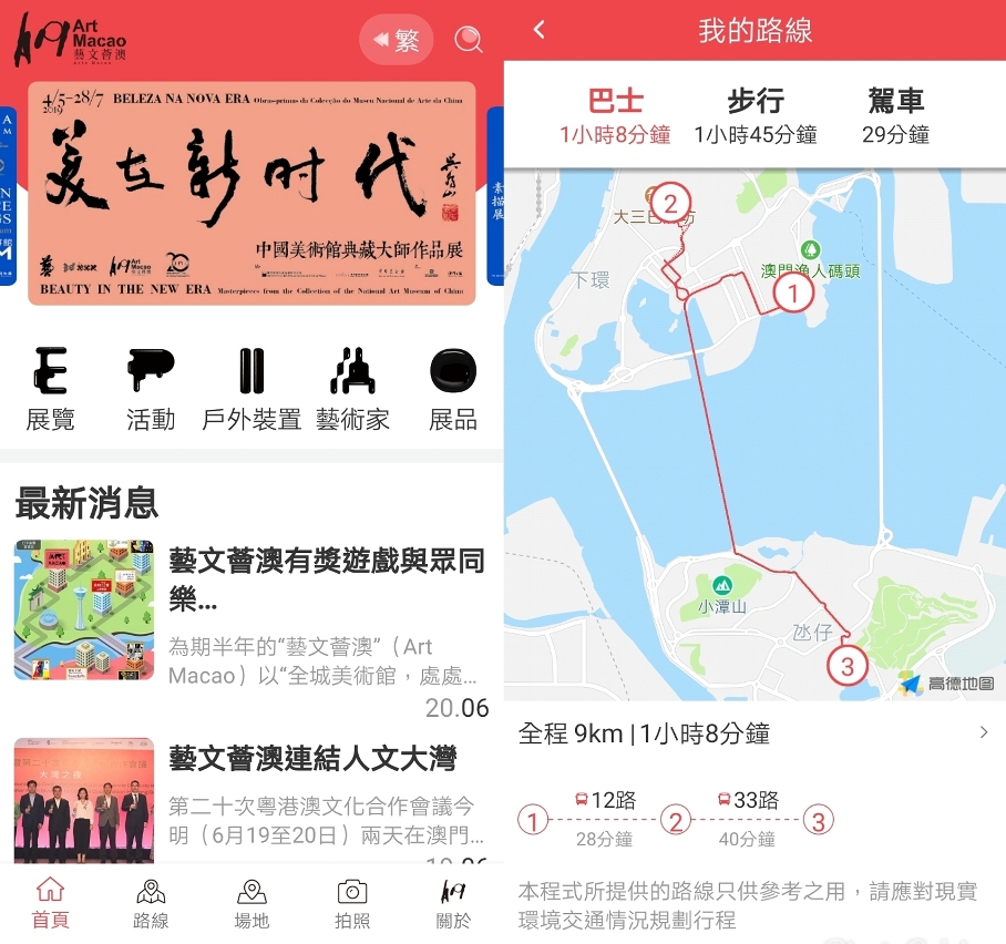 为期半年之“艺文荟澳”(Art Macao)以全城艺术节庆的方式在澳门48个地点带来全新的城巿艺术文化体验,呈献连串国际艺术展览、表演活动、国际青年节庆、高校视艺展示等多元视听盛宴共41项。为方便观众省时又便利地到达各个展示艺术作品的地点,同名手机应用程式“艺文荟澳”特设“路线规划”功能,供市民游客简易安排行程,同时取得最新活动资讯。
