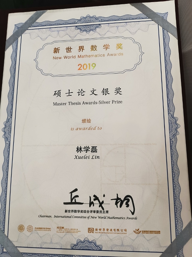 澳门大学科技学院数学系硕士毕业生林学磊于北京清华大学召开的“第八届世界华人数学家大会"上,获2019年“新世界数学奖”的优秀硕士论文银奖,是澳门首次获得该奖项。新世界数学奖是全球华人学子的最高数学奖项,今届(2017至2019年)全球只有4名华裔学生获得硕士论文银奖,而硕士论文金奖空缺。