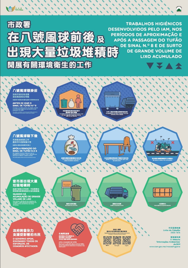 市政署会因应台风及风暴潮对本澳影响的程度,开展一系列环境卫生的工作。包括倘若台风期间出现严重水浸,市面出现大量垃圾堆积时,市政署会在受影响的低洼地区增设五十五个临时垃圾收集点、压缩式垃圾车及大型环保斗等,以方便居民弃置垃圾,提升善后工作的效率。为方便市民查阅临时垃圾收集点之位置,有关资讯已上载至环境卫生网www.iam.gov.mo/macaohygiene/c/tempgarbage/map;市民亦可透过手机扫瞄该二维码连结至网页,网页内除可查阅临时垃圾收集点的地址,更附有现场图片,让市民便捷掌握最新临时垃圾收集点的位置及资讯。
