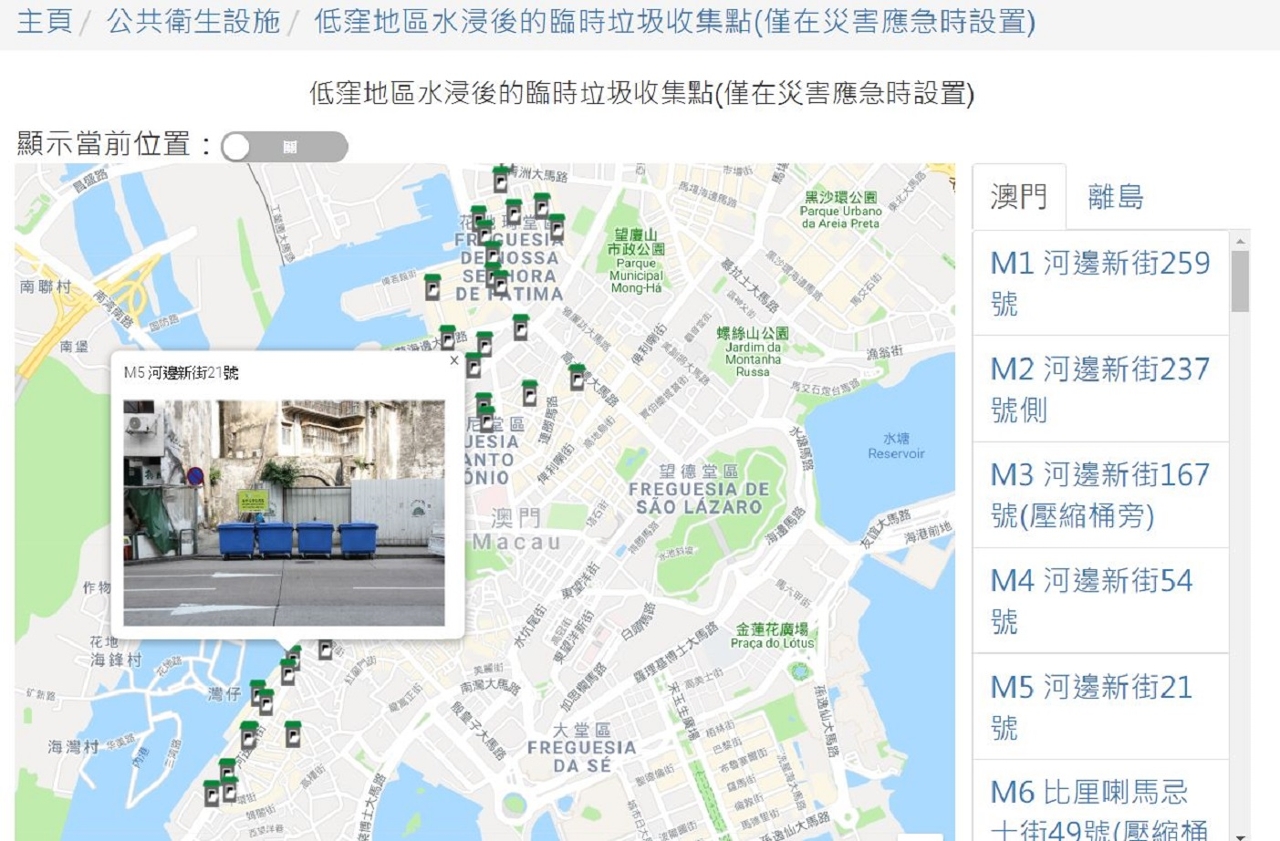 本澳现正进入台风季节,为应对台风及风暴潮可能出现的环境卫生状况,市政署制定一系列措施并持续宣导推广,当中有关五十五个「低洼地区水浸后设置之临时垃圾收集点」的资讯已上载至环境卫生网,市民亦可透过扫瞄二维码连结网页,便捷的查阅最新临时垃圾收集点的位置及资讯。