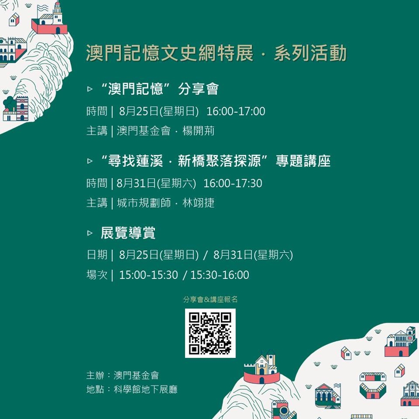 压轴活动为第二场“澳门记忆”分享会及“寻找莲溪.新桥聚落探源”专题讲座,分别于8月25及31日下午4时于科学馆举行。分享会继续由澳基会杨开荆主持;专题讲座邀请了城市规划师林翊捷主讲,聚焦社区发展,探讨莲溪及新桥聚落的缘起与消失。活动名额有限,有兴趣的市民可前往澳门基金会网站或“澳门记忆”文史网报名。同日下午3时及3时半,澳门基金会设有“澳门记忆.文史网特展”导赏活动,并有华夏小灵精与市民同乐,免费入场,欢迎大小朋友参加。查询展览及各项活动详情,可于办公时间内致电8797 8500或电邮macaumemory@fm.org.mo。