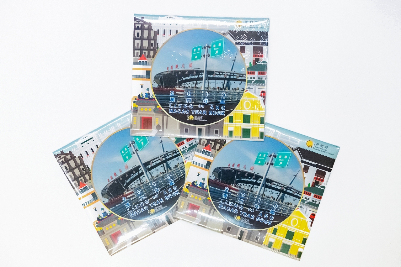 《2019澳门年鉴》光碟精装包括《澳门年鉴》一张光碟和邮品《港珠澳大桥》小型张,表达新闻局配合特区政府的施政方针,对澳门文化创意产业发展的支持。