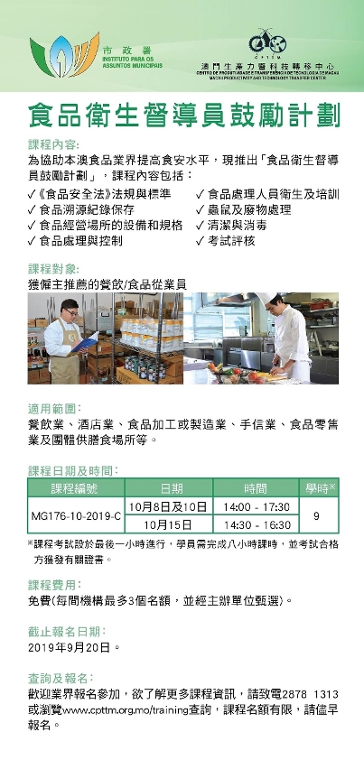 10月份“食品卫生督导员课程”现正接受报名,报名日期至9月20日,欢迎有兴趣的食品业界参加。有关课程资讯或报名详情可浏览市政署食品安全资讯网www.foodsafety.gov.mo、澳门生产力暨科技转移中心网站www.cpttm.org.mo/training,或致电2878 1313查询。
