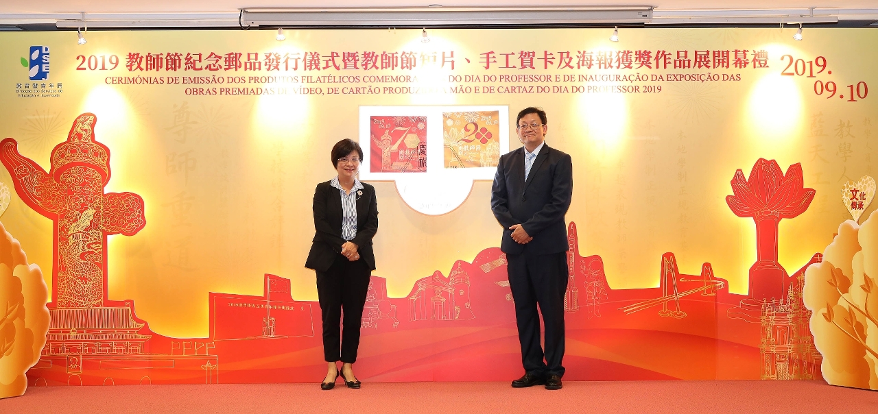 教育暨青年局今年继续与邮电局合作发行教师节纪念邮品,并举办教师节短片、手工贺卡及海报设计比赛,作为庆祝教师节的重点活动。9月10日上午在教青局仲尼堂举行2019教师节纪念邮品发行仪式,在教青局辖下教育资源中心子瞻廊举行2019教师节短片、手工贺卡及海报获奖作品展开幕礼。教青局局长老柏生、邮电局局长刘惠明、中央人民政府驻澳门特别行政区联络办公室教育与青年工作部部长徐婷、教青局副局长梁慧琪及龚志明、教育发展基金行政管理委员会委员财政局副局长钟圣心、澳门中华教育会会长陈虹、澳门天主教学校联会会长周伯辉、澳门公职教育协会监事长许淑贞,非高等教育委员会委员、青年事务委员会委员、教学人员专业委员会委员、教师培训工作协调咨询小组成员、2017/2018学校年度卓越表现教师及学校代表等出席了发行仪式及开幕礼。