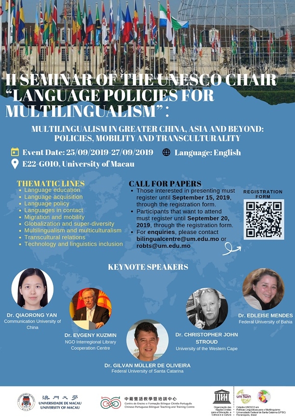 由澳门大学人文学院葡文系“中葡双语教学暨培训中心"与联合国教科文组织“多语语言政策”协会合办的国际研讨会将于9月25日(周三)揭幕。大会将以“大中华区、亚洲及其他地区的多语言:政策、流动性和跨文化性”为题,与来自世界不同地方的专家学者一同分享多语言教育的最新研究。欢迎参与。