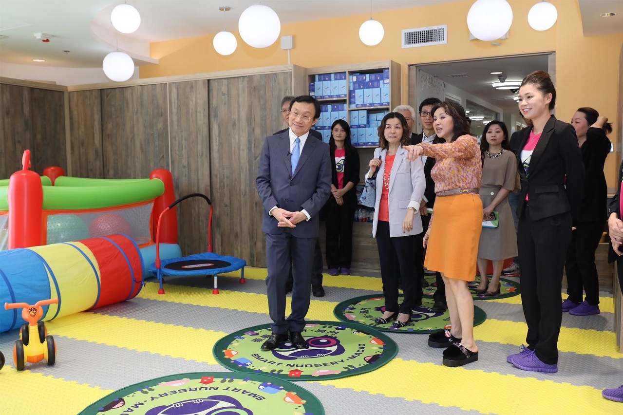 随后,谭俊荣一行视察同位于日升楼的崇专托儿所,参观托儿所的活动室、幼儿单车径、厨房、多用途室、图书阁等,谭俊荣详细了解托儿所的服务宗旨、服务特色、收托安排及人力资源情况,赞扬该所引入智能科技,方便家长和所方沟通;提供中、英、葡三语的培育安排,以及透过探索设备及环境引发儿童学习的动机等。该所本年9月16日起已投入服务。