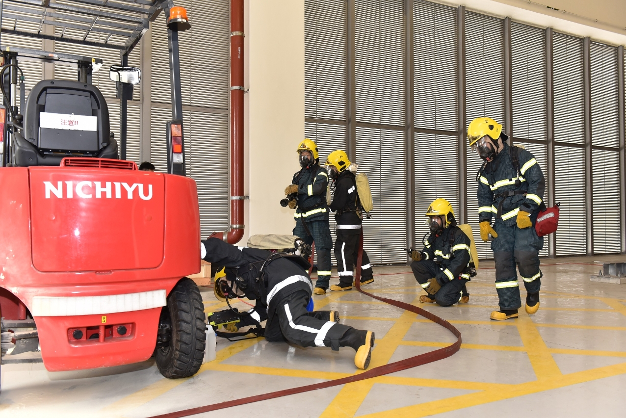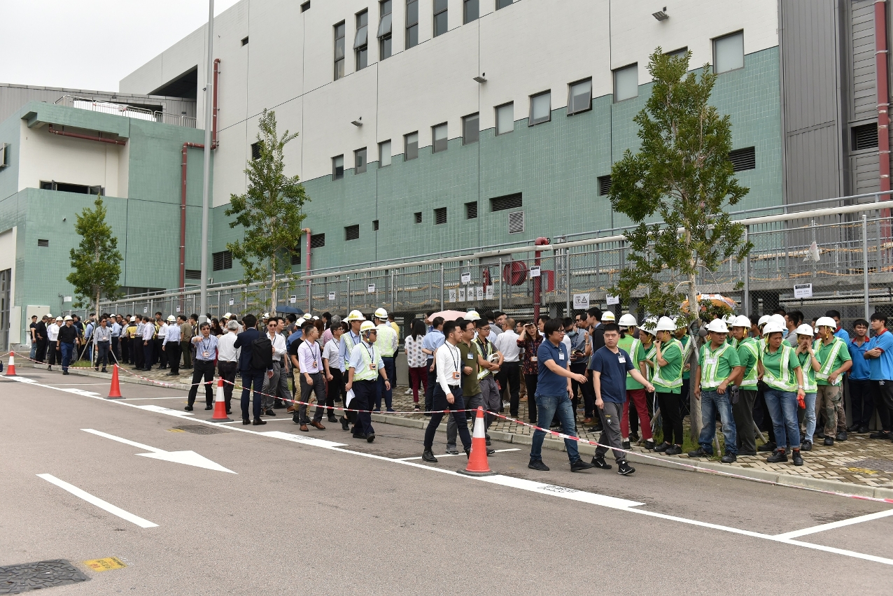演习模拟轻轨车厂维修区内有一辆电池机车冒出浓烟而触发火警警报系统,车厂保安中心致电消防局求助,同时启动紧急疏散程序。期间保安人员尝试扑灭火警,本局接报后随即按相关预案派出紧急车辆及人员到达现场,并向车厂保安人员瞭解情况,随即展开灭火救援工作。