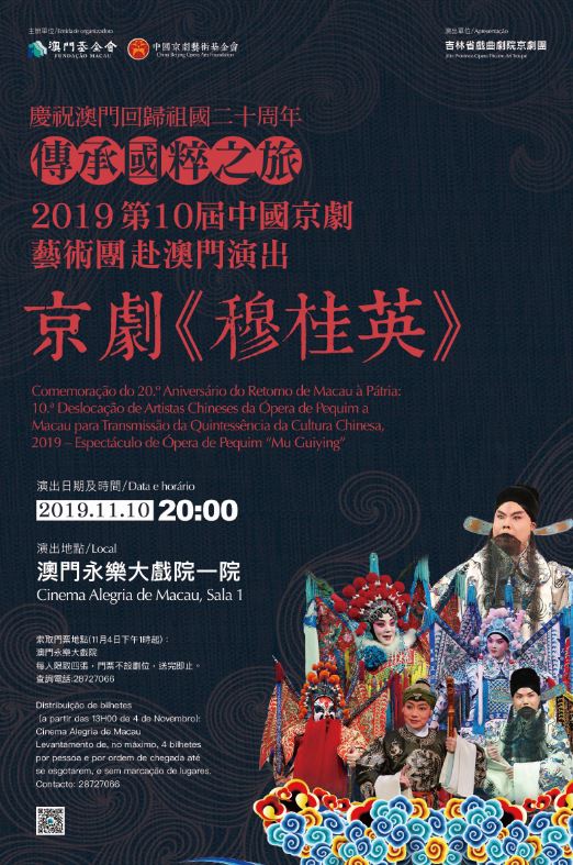 由澳门基金会及中国京剧艺术基金会主办,“中国京剧艺术团赴澳门演出交流”活动载誉归来!本年度2019第10届中国京剧艺术团赴澳门演出京剧《穆桂英》将于11月10日晚上八时在澳门永乐大戏院隆重开演,并于11月4日起向公众免费派发入场门票。