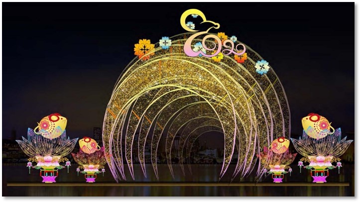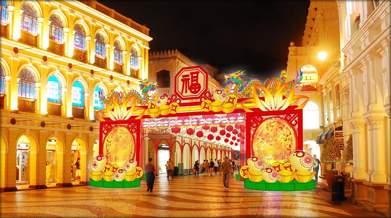 市政署在全澳各区的主要街道、广场、公园、圆形地等放置富有农历新年气氛的灯饰,布置地点共有七十八个,包括澳门半岛五十五个、氹仔十五个及路环八个。灯饰布置以「金鼠迎春贺新禧」为主题,除了传统的大型宫灯外,还有各式金鼠造型的大型灯组、小型吊挂灯饰以及小型金鼠座地灯饰。议事亭前地将设置一座以绿墙及各式新春元素为背景的大型舞台,以及充满农历新年节日气氛的大型灯光隧道。透过各式各样,分布于全澳各区的贺岁灯饰,让市民及游客感受浓厚的农历新年节日气氛。