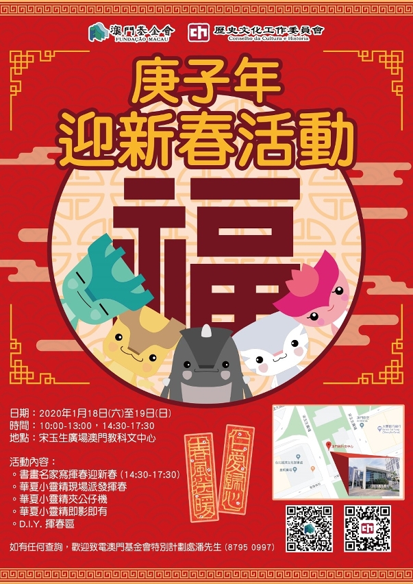 由澳门基金会及其历史文化工作委员会主办,庚子年迎新春活动将于2020年1月18日及19日(星期六、日)于新口岸宋玉生广场澳门教科文中心举办,开放时间为上午10时至下午1时;下午2时30分至5时30分,活动向全澳市民免费开放,欢迎参与。