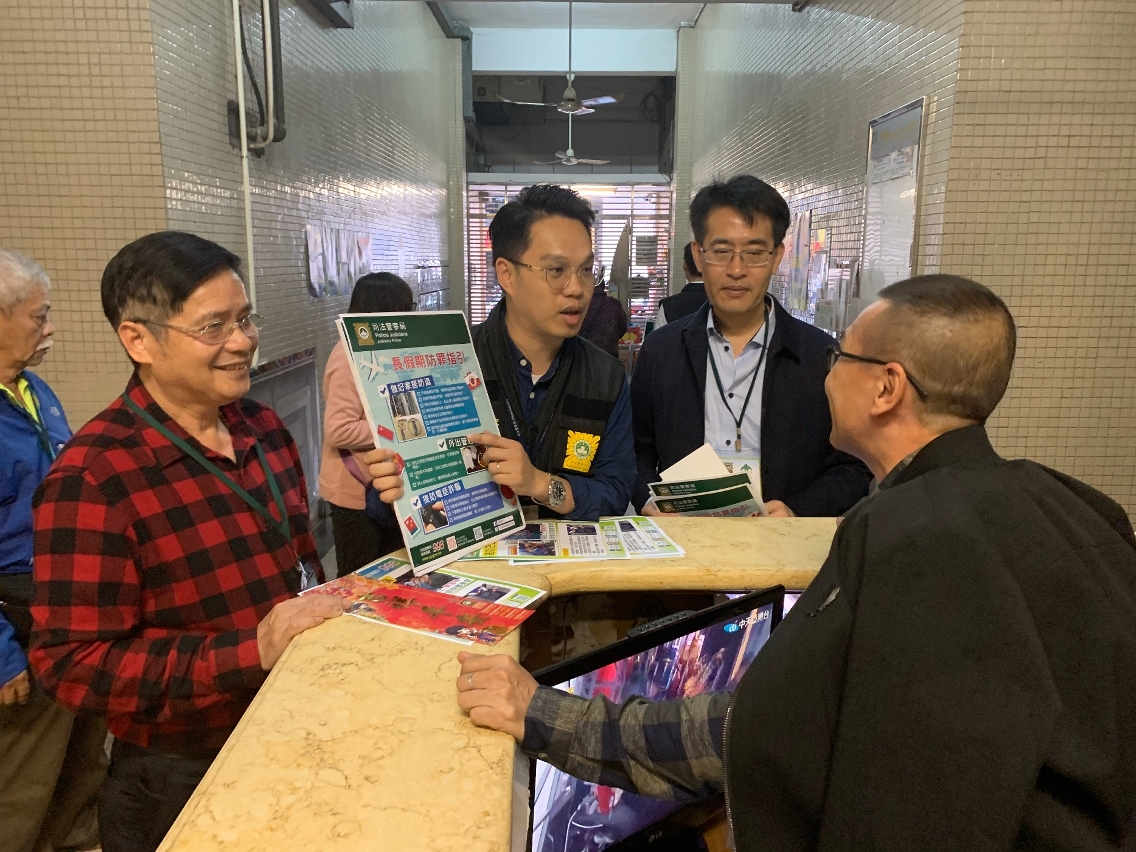 此外,司警局人员还先后联同上述社团代表及“司警局大厦防罪之友"会员巡查社区治安黑点,以及到各区的住宅和工业大厦、休憩区、巴士站及商铺进行冬防宣传,向居民、商户和物业管理人员讲解冬防资讯并瞭解区内的治安情况。司警局人员特别提醒居民在节假日期间须做好家居防盗措施,前往人多挤迫地方时应注意安全,保管好个人财物;呼吁大厦管理人员加强大厦保安工作,如发现或怀疑犯罪,应马上向警方举报。