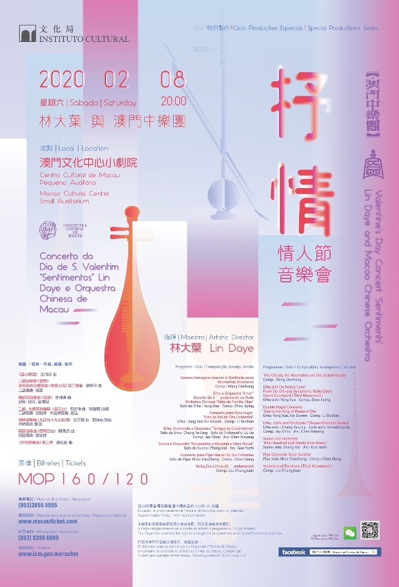 《抒情》情人节音乐会让观众感受中乐心动之美,欢迎各位爱乐人士亲临观赏,音乐会完场后将设有签名会。门票现正于澳门售票网发售,价格分为160及120澳门元,设多项购票优惠。详情可致电8399 6679或浏览www.icm.gov.mo/ochm。