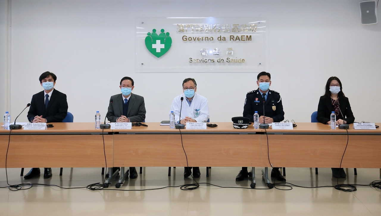 新型冠状病毒感染应变协调中心(下称应变协调中心)于今(5)日举行「新型冠状病毒最新情况及本澳各项防控措施」记者发布会,仁伯爵综合医院李伟成医务主任、疾病预防控制中心林松主任、治安警察局策划行动厅赵崇远厅长、教育暨青年局教育研究暨资源厅黄健武厅长、旅游局执照及监察厅陈露厅长共同会见传媒。