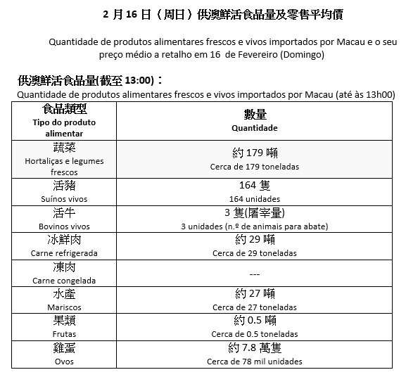 2月16日(周日)供澳鲜活食品量及零售平均价