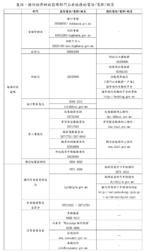 查询、预约经济财政范畴部门公共服务的电话/电邮/网页