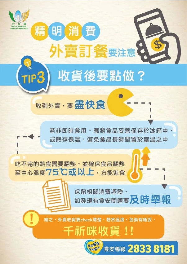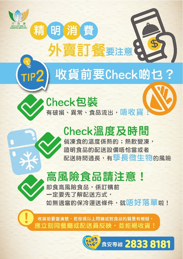 为减少人群聚集,降低疾病传播风险,居民避免在餐饮场所堂食,并以外卖方式消费。为此,市政署提醒消费者,须清楚所订购的外卖食品可能存在的食安风险,消费之前必须慎选卫生可靠、信誉良好的餐厅食肆或第三方网络餐饮配送平台;同时留意运送条件,如必须配备安全且卫生的运载设备,热食须存于保温箱,生冷即食食品须存于冷藏设备中,尤其高风险生鲜即食食品(如刺身、生蚝及沙律等)要特别留神,若没有适当的保冷运送设备,则不应落单。