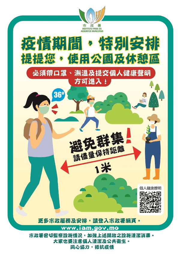 市政署辖下公园及休憩区等部份户外设施,由二月二十日起有限度开放,并按照卫生当局的指引作出管理,包括进行体温测量、要求佩戴口罩等,大部份市民均配合,但发现有少数市民未有佩戴口罩,市政署再次呼吁市民应佩戴口罩,避免群聚活动。市政署除派员巡视外,亦制作图文包并以广播的方式加强劝吁,敬请市民配合有关安排,共同防疫。