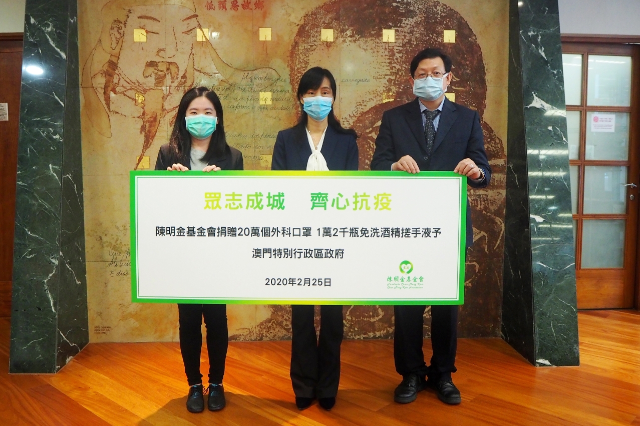 陈明金基金会今(25)日向特区政府捐赠20万个口罩及1万2千瓶免洗酒精搓手液,由教育暨青年局接收,受赠物资将分发予有需要的学校。
