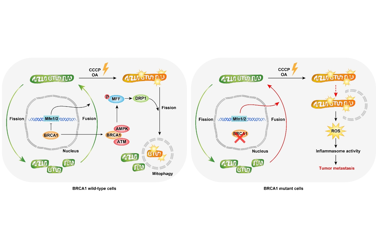 BRCA1是重要的抑癌基因,在维持细胞基因组稳定性中发挥重要作用,其突变提高女性罹患乳腺癌的风险,是导致遗传型乳腺癌的主要原因,并且多数为三阴性乳腺癌。最近,澳门大学健康科学学院研究团队利用携带BRCA1乳腺特异敲除的小鼠进行研究,发现BRCA1在线粒体自噬及线粒体动力学方面具有重要调控作用,可通过促进线粒体自噬清除损伤线粒体及降低炎症小体活性来抑制手术后乳腺癌的复发及转移。