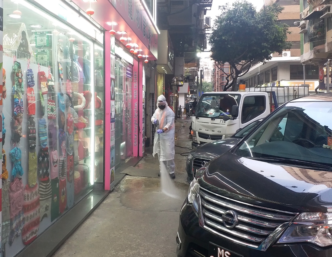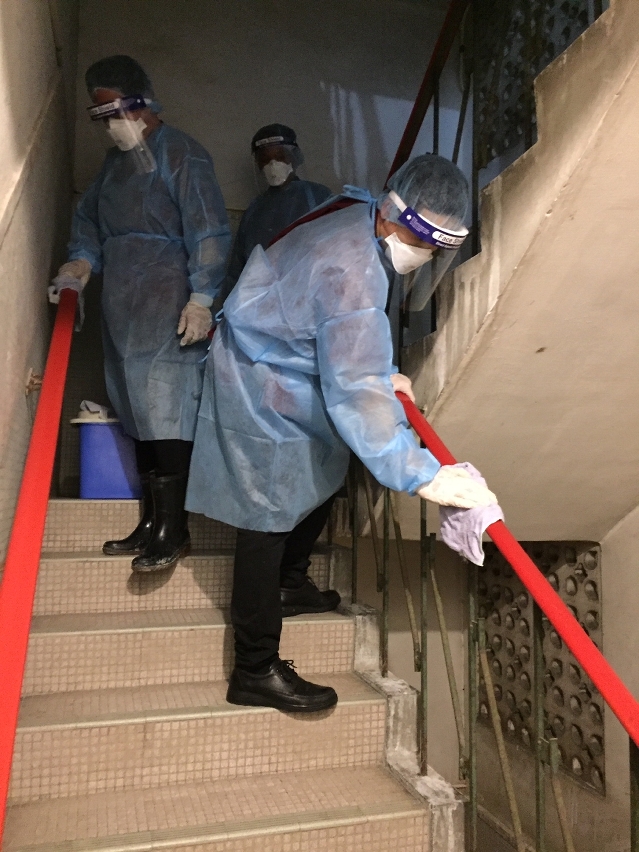 配合防控工作,市政署今日(三月十八日)即时协调清洁专营公司及外判清洁加派人手,于本澳第十五例确诊病例居所周边街道、大厦各楼层梯间等公用空间进行大型清洁及消毒工作,尽力减低传染病传播的条件。
