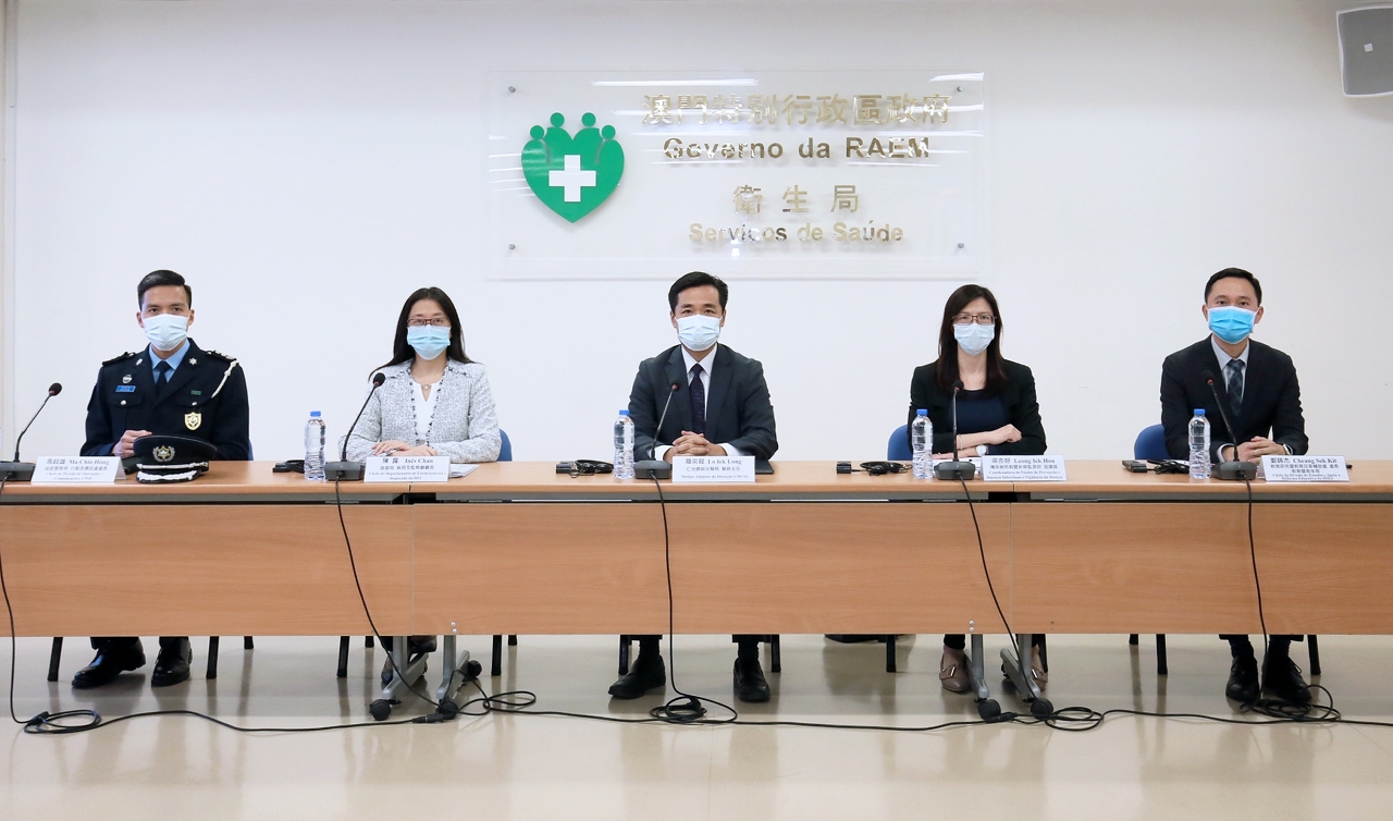 新型冠状病毒感染应变协调中心(下称应变协调中心)于今(22)日举行例行记者会,仁伯爵综合医院罗奕龙医务主任、旅游局执照及监察厅陈露厅长、教育暨青年局教育研究暨改革处郑锡杰处长、治安警察局公共关系处李德辉处长及疾病预防控制中心传染病防制暨疾病监测部梁亦好协调员共同会见传媒。