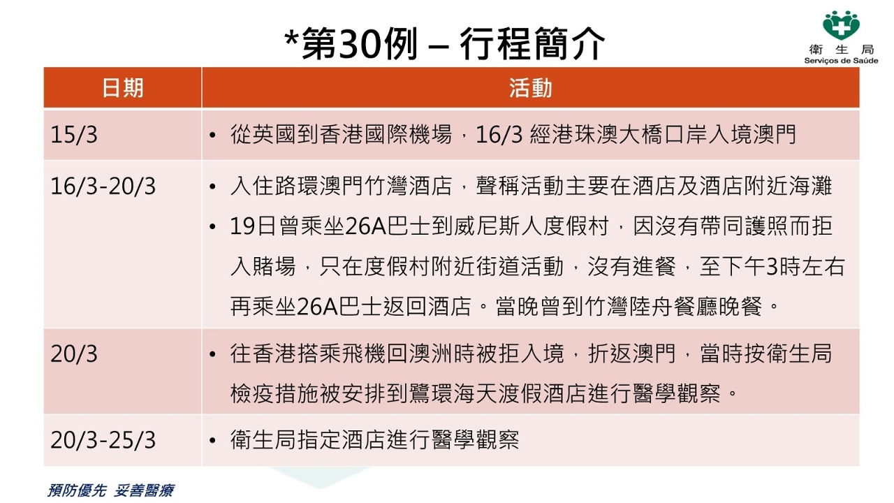 患者为52岁男性澳洲籍旅客。从英国到香港国际机场,3月16日 经港珠澳大桥口岸入境澳门。16至20日,入住路环澳门竹湾酒店,声称活动主要在酒店及酒店附近海滩。19日曾乘坐26A巴士到威尼斯人度假村,因没有带同护照而拒入赌场,只在度假村附近街道活动,没有进餐,至下午3时左右再乘坐26A巴士返回酒店。当晚曾到竹湾陆舟餐厅晚餐。