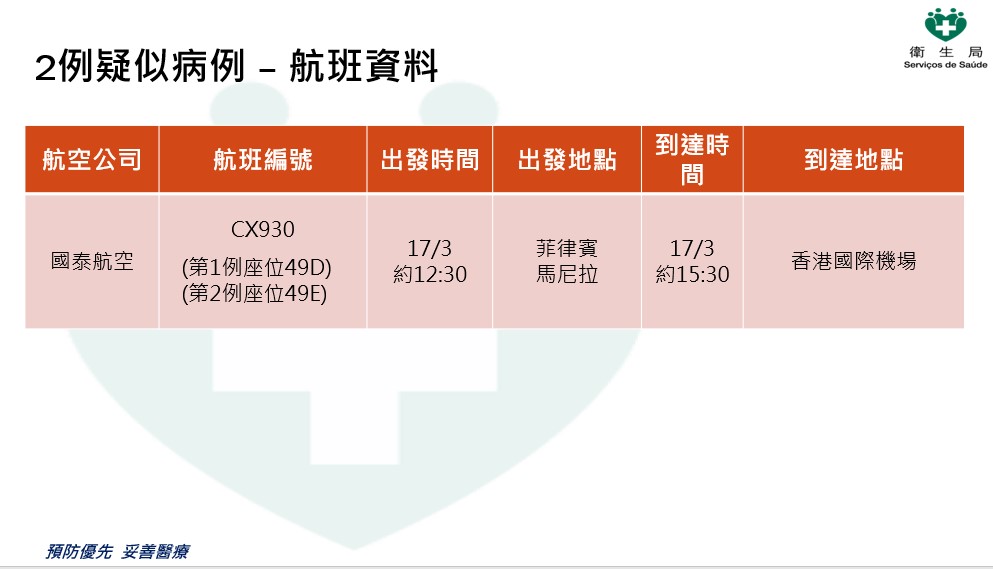 2患者均为菲律宾藉外雇,为朋友关系。一人是31岁男性,另一人为37岁女性。两人于3月17日乘搭国泰航空(CX930,座位号49D及49E)从菲律宾马尼拉到达香港。抵达香港国际机场后,即乘坐金巴经港珠澳大桥口岸入境澳门。到达港珠澳大桥口岸时,被卫生局口岸检疫人员按当时的措施要求居家医学观察14天,入境时无症状,体温正常。男患者是某饼店仓务员;女患者为某酒店清洁员。两人在居家隔离期间没有上班和外出,同时,两人于独立房间隔离,没有与其他人接触。
