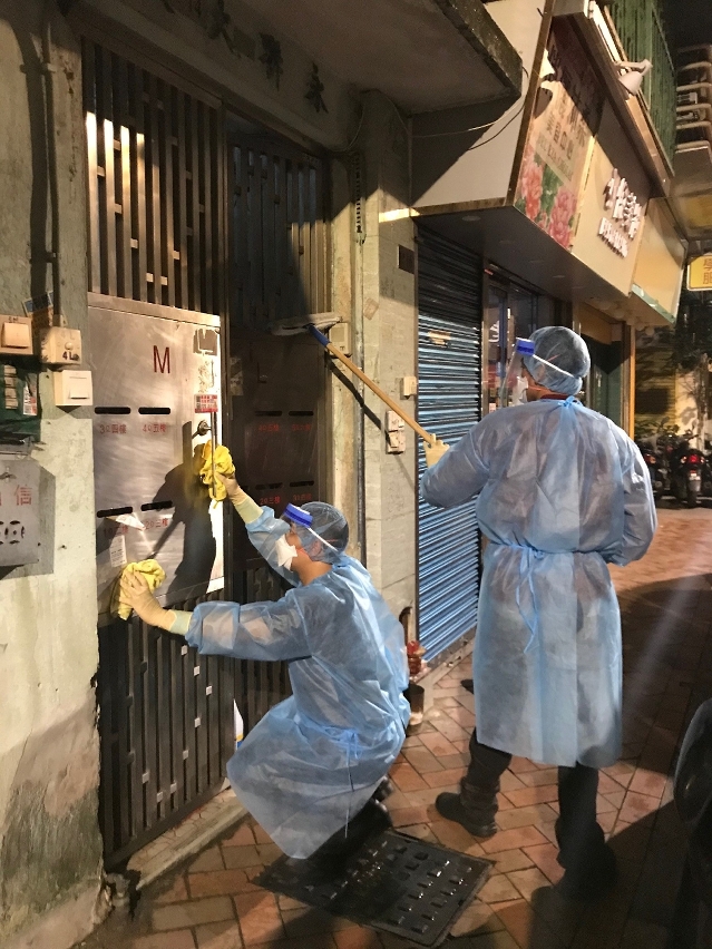 因应新型冠状病毒肺炎的最新情况并配合防控工作,市政署3月27日凌晨即时协调清洁专营公司及外判清洁加派人手,于本澳32及33例确诊病例居所周边街道、大厦门口及各楼层楼梯等公用空间进行大型清洁及消毒工作,尽力减低传染病传播的条件。
