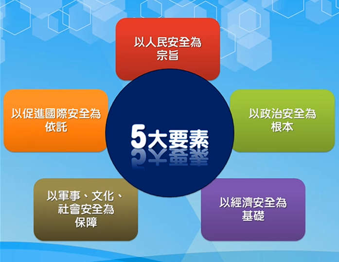 “国家安全走进校园”网络图片展中设有 “坚持总体国家安全观 依法维护国家安全” 章节,当中透过 “五大要素”、 “五对关系”、 “重点领域” 、 “完善国家安全法律体系 保障国家安全和社会稳定” 等方面作介绍。