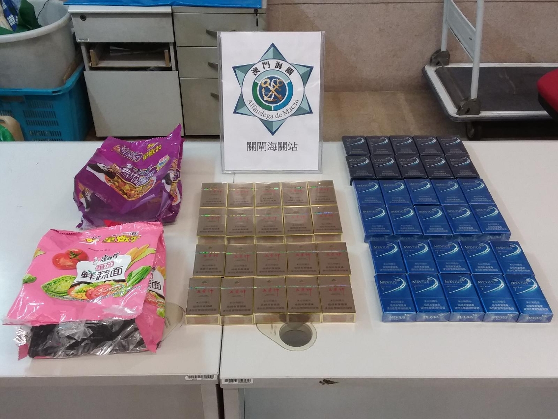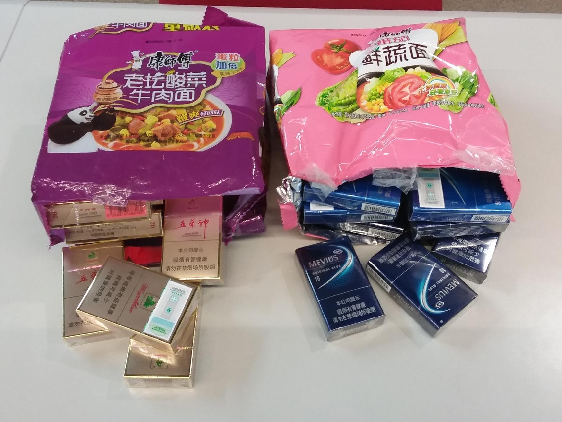 在海关的重点打击行动下,水客活动已经大大减少,但亦有不法之徒心存侥幸,尝试改变偷运方式,企图利用日常用品的包装外观作掩饰,偷运违法物品来澳。案件发生于本月22日,海关人员在关闸口岸截查一名多次不正常往返本澳的入境人士,当时其手持的胶袋内装着两大包即食面,关员察觉其行色匆匆、神色有异,欲规避海关检查,关员遂将其截停并以X光机扫描其手持的物品,结果发现即食面包装袋内藏有非即食面的可疑物品,经打开包装检查,发现有人利用即食面包装袋作掩饰,将袋内即食面全数更换为香烟,再用胶纸封口重新包装,试图蒙混过关,但终被海关关员查获共1,000支未完税香烟。