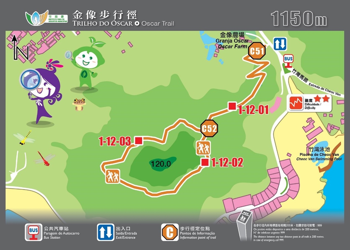 新建成的金像步行径出入口均位于竹湾马路,邻近金像农场,全长约一千一百五十米,是一条循环式步行径。金像步行径沿途风景优美,两旁植有本澳树种:枫香、山乌桕及木荷等。沿步道梯级向上走,可到达山顶的平台,此处更可眺望路环乡村马路及竹湾海面一带。市民在远足登高同时,亦有机会观察到在丛林间的画眉、白头鹎及暗绿绣眼等本澳常见雀鸟的踪影。