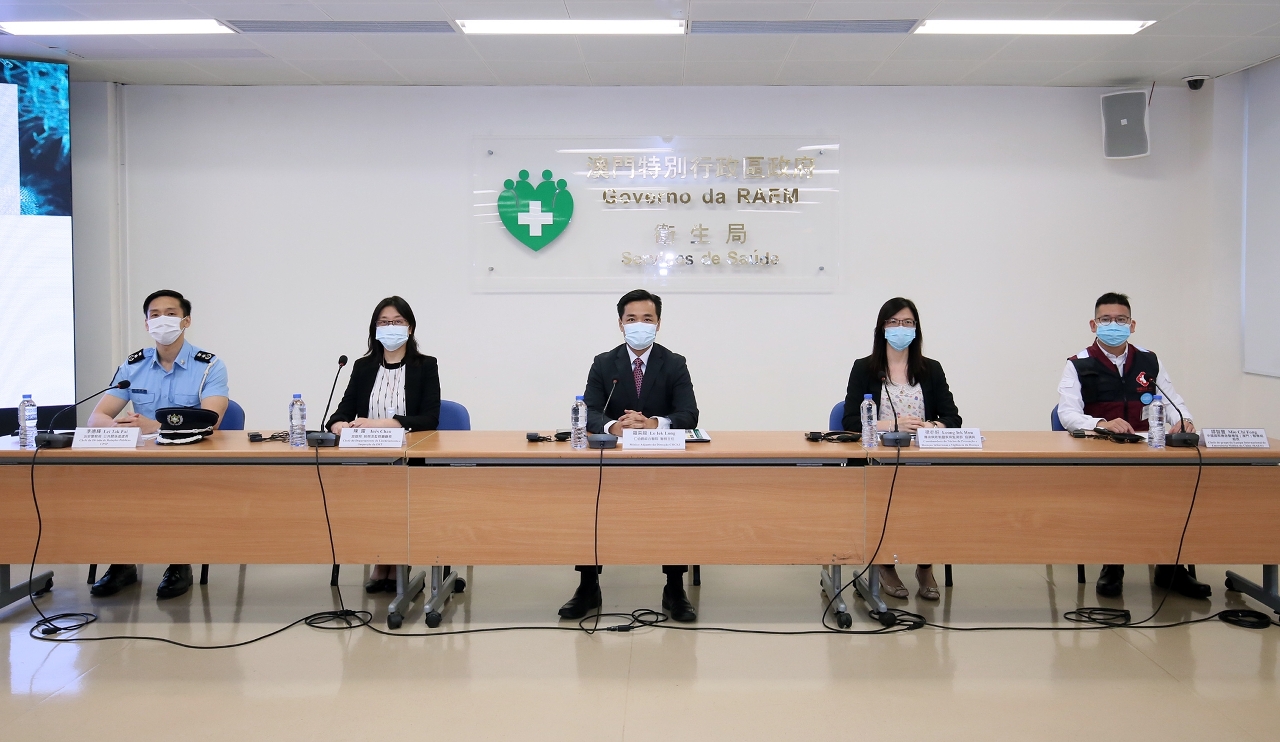 新型冠状病毒感染应变协调中心于今(12)日举行例行记者会,仁伯爵综合医院罗奕龙医务主任、旅游局执照及监察厅陈露厅长、治安警察局公共关系处李德辉处长、疾病预防控制中心传染病防制暨疾病监测部梁亦好协调员、中国国际应急医疗队(澳门)医疗组组长仁伯爵综合医院急诊部缪智丰医生共同会见传媒。