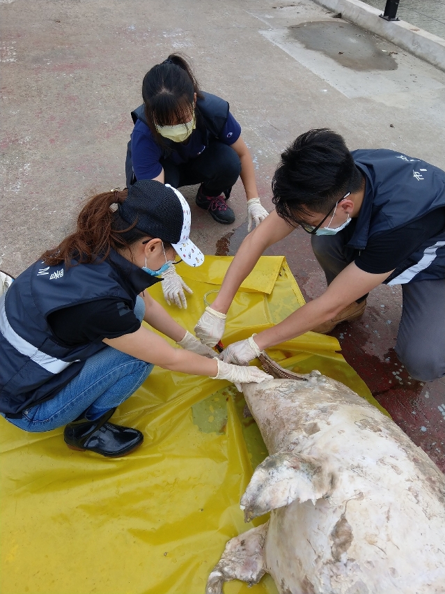 市政署接报后已即时安排人员到现场跟进。经检查和初步测量后,鉴定该海豚属成年中华白海豚,体长2.4米,发现时已经严重腐烂,腹部因气体膨胀以致破裂,未见外伤,估计搁浅前已死亡,随海水漂流至沿岸。由于尸体已严重腐烂,基于卫生考虑故将作火化处理。