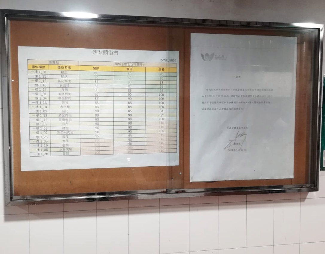 考虑近日供澳活猪数量逐渐增加,供应趋稳定,但公共街市的零售价格仍然严重偏高,并未回落到合理水平,而为进一步解决猪肉价格问题,市政署今日向各街市猪肉摊贩发公告,要求各街市猪肉摊檔的承租人自明日(五月二十三日)起,将猪肉零售价调整至合理的水平,以回应市民诉求,承担应有的社会责任。对于猪肉零售价过高而谋取不合理利润的承租人,市政署将会采取措施,必要时将依法终止有关摊檔的租赁合同。