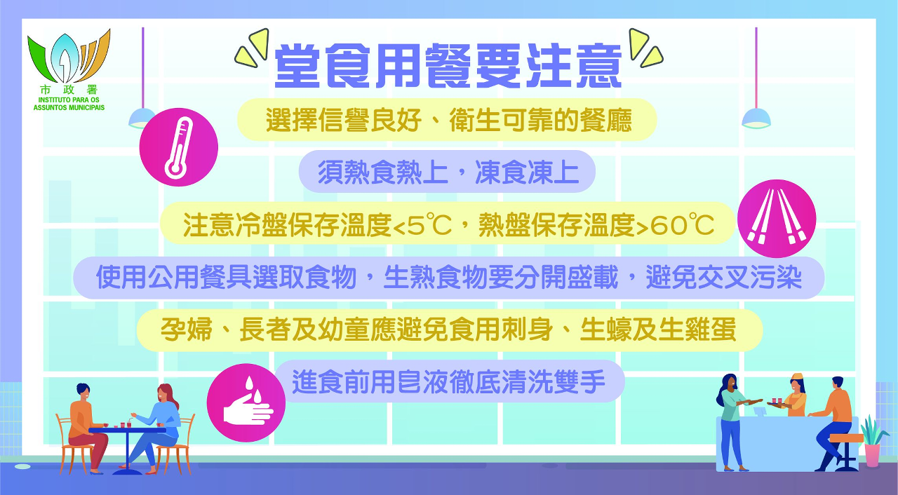 市政署已于食品安全资讯网www.foodsafety.gov.mo设置了「夏日食品安全」专页及「【精明消费】外卖订餐要注意」专页,欢迎市民及业界登入网站浏览,获取更多食安资讯。