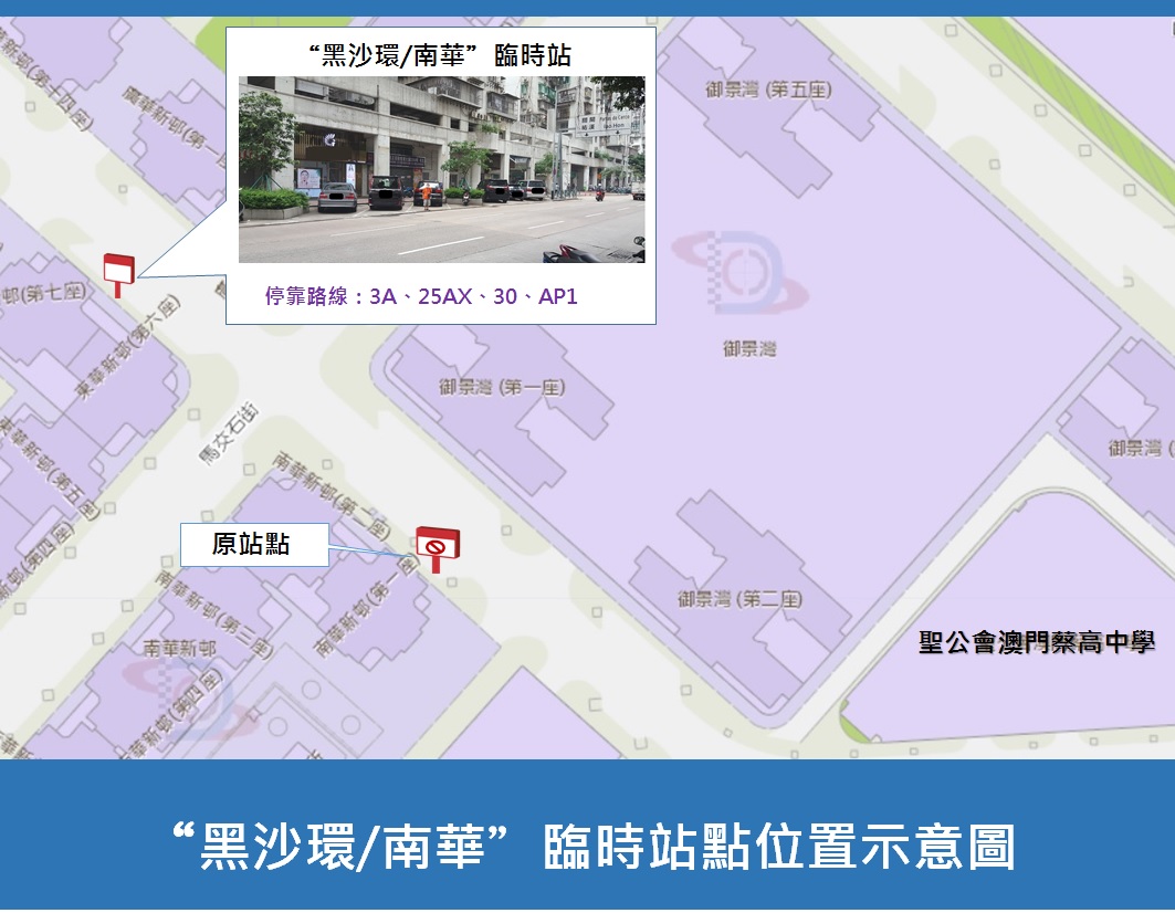 为保障道路使用者安全,市政署开展维修渠盖工程,黑沙环新街近南华新邨路段6月3日(周三)上午10时至下午5时实施有限度通车,黑沙环新街部份咪表泊车位暂停使用;巴士方面,“黑沙环新街/南华”巴士站临时停用,多条停靠该站的巴士路线调整停靠临时站,详情请参阅附表。市政署及交通事务局呼吁公众留意。