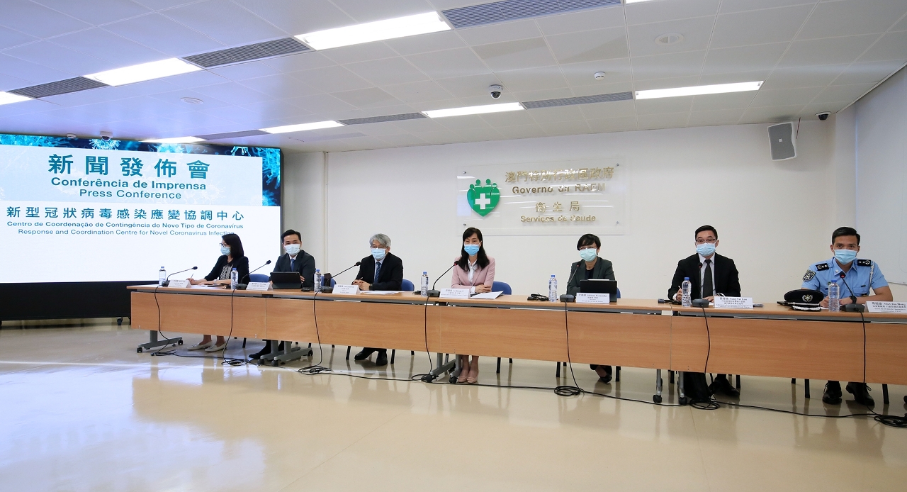 新型冠状病毒感染应变协调中心于今(10)日举行例行记者会,社会文化司欧阳瑜司长、卫生局李展润局长、旅游局文绮华局长、社会工作局许华宝副局长、贸易投资促进局行政管理委员会黄伟伦执行委员、仁伯爵综合医院罗奕龙医务主任、治安警察局行动及通讯处马超雄处长共同会见传媒。