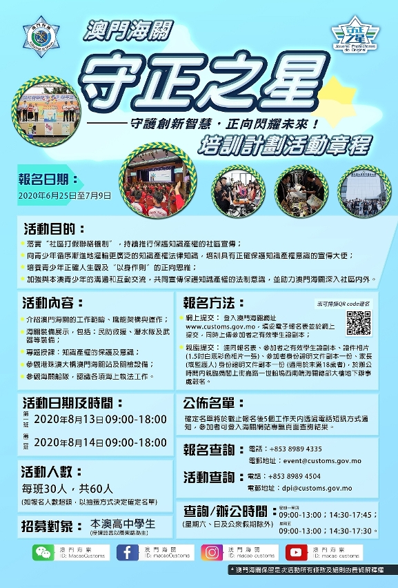 为向青少年灌输更广泛的知识产权法律知识,培养青少年正确人生观及对社会的责任感。澳门海关将开展“守正之星”培训计划,招募对象为本澳高中学生,报名日期由6月25日至7月9日,欢迎踊跃参与。